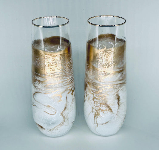 White Shimmer and Gold Wave Resin Art Stemless Champagne Glass Set of Two Customize 9.5 Ounce